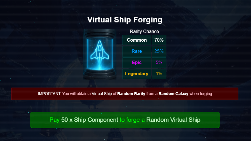 Pay 50 Ship Components per forge to receive a random rarity Ship from a random galaxy: